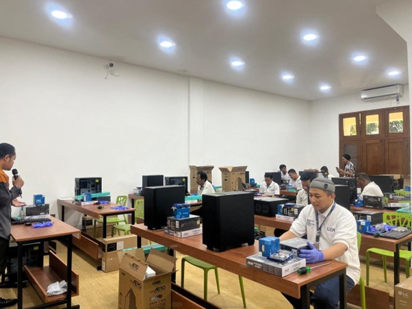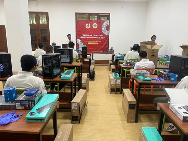 Kegiatan berlangsung interaktif, di mana peserta diberi kesempatan langsung untuk melakukan perakitan unit komputer secara berkelompok dengan pendampingan teknisi dari pihak narasumber.