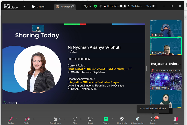 Kuliah umum menghadirkan narasumber Aisanya Wibhuti, Head Network Rollout (PMO Director) PT XL Axiata, Tbk Jakarta, dengan moderator Ir. Unan Yusmaniar Oktiawati, Ph.D yang merupakan Dosen dari Departemen Teknik Elektro dan Informatika UGM.
