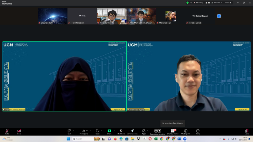 Yogyakarta, 5 November 2025 — Departemen Teknik Elektro dan Informatika (DTEDI), Sekolah Vokasi UGM, menyelenggarakan kuliah umum Kapita Selekta bertajuk “Dream Big in Tech: A Journey and Future Trends.” Acara ini menghadirkan narasumber Andronicus Riyono, S.T., M.T., Senior Customer Success Manager dari Cloudflare Singapore. Sesi berlangsung secara daring dan dimoderatori oleh Ir. Unan Yusmaniar Oktiawati, S.T., M.Sc., Ph.D.